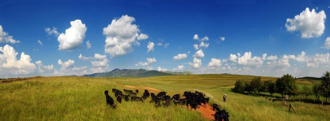 天空高远澄净、山峦连绵起伏、牧场恬静广阔、芳草郁郁葱葱,成群的牛正埋头吃草。