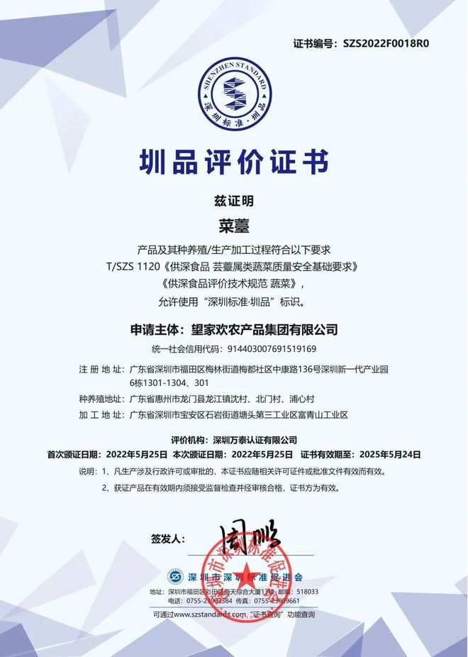 2022年,由我们审报的惠州菜薹正式获得了《圳品评价证书》。这些贴上“圳品”的惠州产品,得到了深圳消费者的喜爱,销量平均提高了30%以上,农户们的收益也更高。农户们实实在在的受益了,标准化种植的积极性不断提高,也吸引了越来越多企业、合作社培育更多标准化“圳品”,打造惠州品牌。