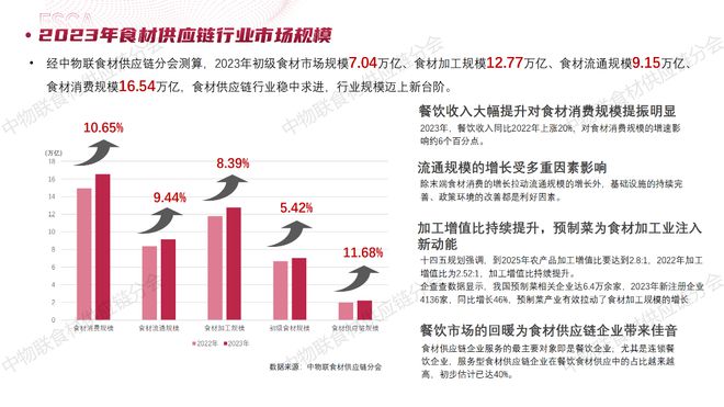 经中物联食材供应链分会测算,2023年初级食材市场规模7.04万亿、食材加工规模12.77万亿、食材流通规模9.15万亿,食材消费规模16.54万亿,食材供应链行业稳中求进,行业规模迈上新台阶。