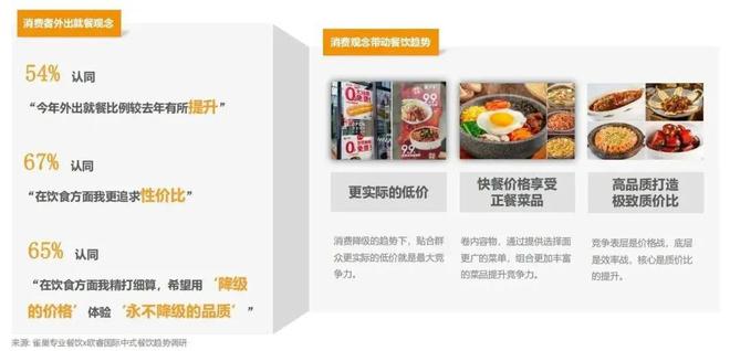 雀巢专业餐饮、世界中餐业联合会、欧睿国际联合发布的《2024中国中式餐饮白皮书》中关于“消费者外出就餐观念”的数据显示,67%的消费者认同“在饮食方面我更追求性价比”,65%的消费者认同“在饮食方面我精打细算,希望用‘降级的价格’体验‘永不降级的品质’”。
