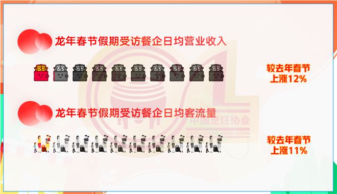据中国烹饪协会开展的“龙年春节假期餐饮企业经营情况调研”数据显示,除夕至正月初八(2月9日—17日)受访餐饮企业日均营业收入与去年春节相比上涨12%,日均客流量与去年春节相比上涨11%。