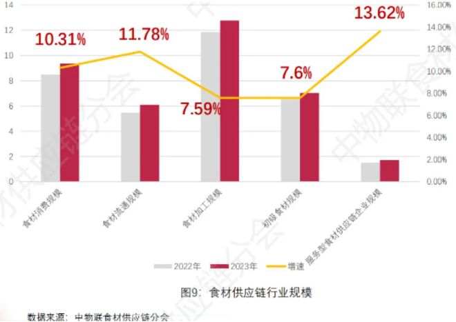 据测算,2023年初级食材市场规模7.04万亿、食材加工规模12.77万亿、食材流通规模6.10万亿食材消费规模9.37万亿,食材供应链行业稳中求进,行业规模迈上新台阶。