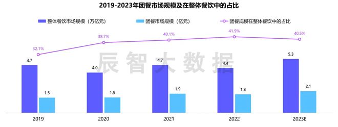 日前,辰智大数据发布了《2024中国团餐产业趋势解读》显示,近5年团餐市场规模及在整体餐饮中的占比呈现稳健发展态势,市场规模由2019年的1.5万亿增至2023年的2.1万亿,占比也由32.1%增至40.5%,团餐已成为餐饮市场的中坚力量。