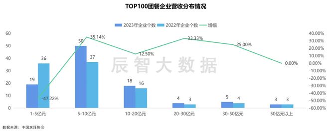团餐市场虽然玩家众多,但整体集中度较低。《解读》称,企业数量增幅最快的是营收5亿-10亿元的团餐企业;营收增长最快的是营收20亿-50亿元的团餐企业。整体来看,团餐TOP100企业的结构分布逐步由金字塔型向橄榄型发展。