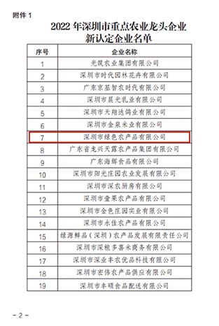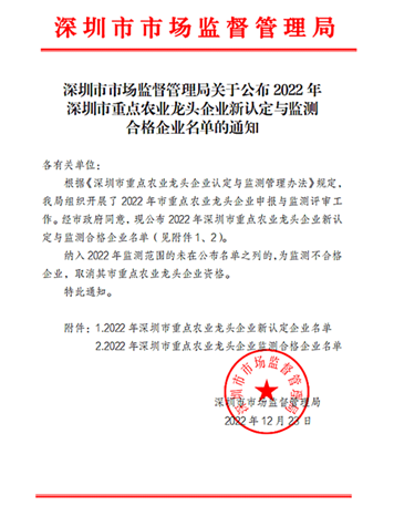 近日,深圳市市场监督管理局公布了 2022 年深圳市重点农业龙头企业新认定与监测合格企业名单。此次,共有34家企业新晋市级龙头,其中,望家欢集团旗下深圳市绿色农产品有限公司荣誉登榜!
