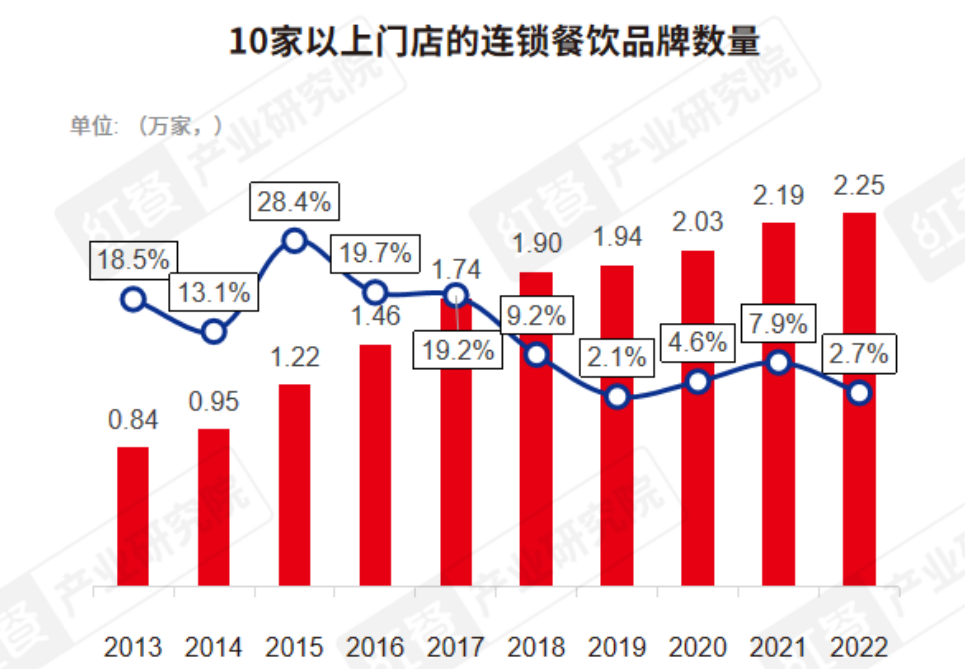 另据红餐大数据,国内10家以上门店的餐饮品牌数量在过去10年中稳步提升,从2013年的0.84万家,增长到2022年的2.25万家,增长约27倍。一般而言,当连锁餐饮品牌门店数达到10家的时候,就必须引入专业的供应链服务商来支持规模化运营。因此未来供应链企业获得的市场机会也会越来越多。