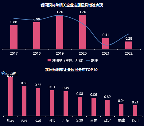 数据显示,我国现存6.6万家预制菜相关企业。2022年共2799家预制菜企业注册,同比减少31.7%。现存企业数量中,山东、河南、江苏分别排名前三。