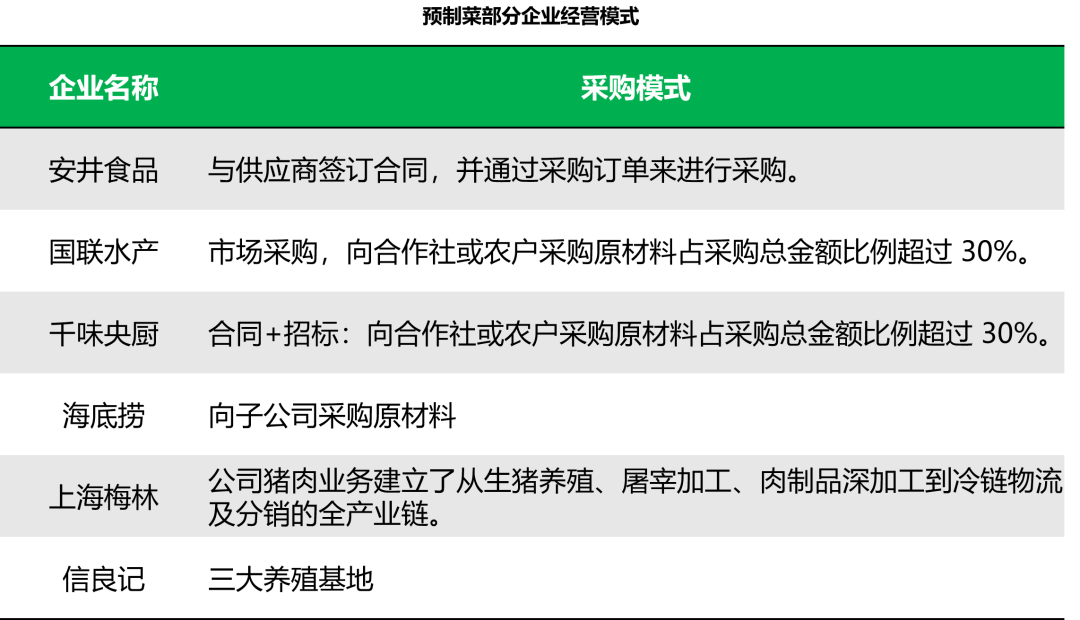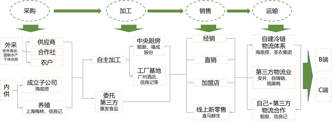 内部直供模式:一方面,企业成立子公司进行原材料生产,如海底捞成立蜀海;另一方面,企业从事养殖业务,自主生产原材料,如上海梅林、信良记等。