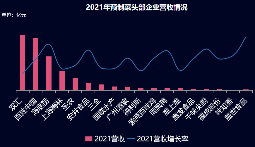 从总营收看,18家预制菜上市企业中,2021年度营收在100亿元以上的有5家,营收在50亿元以内的有2家企业,10亿元-50亿元的有9家,2家企业营收低于10亿元。其中,超五成企业2021年度营收较2020年度有所增长,海底捞营收同比最高,表明预制菜市场的不断向好发展。