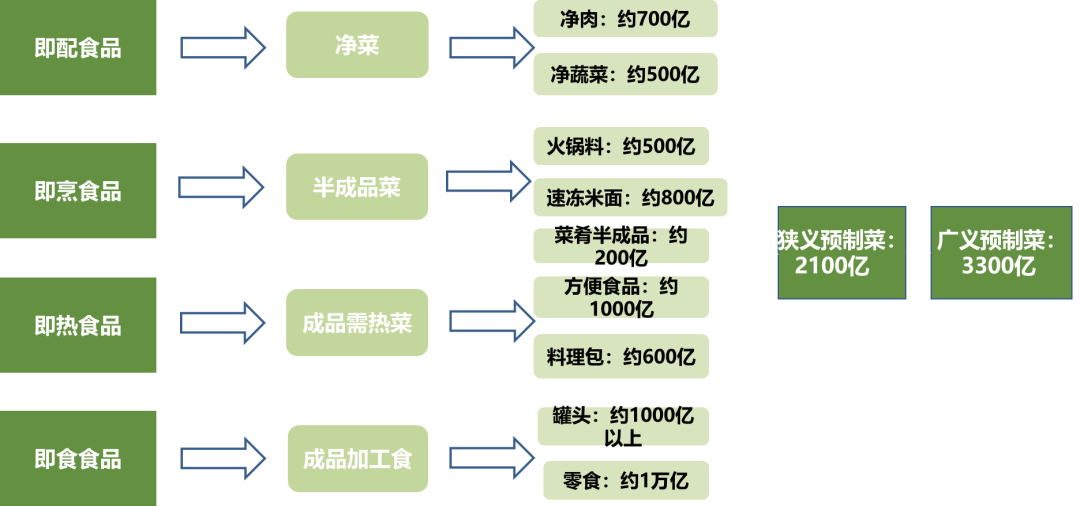 广义的预制菜,包含主要的速冻食品以及预制菜肴、料理包、净菜,预计可以达到3300亿规模左右(出厂口径),如果按照狭义的预制菜,仅包含半成品预制菜肴、料理包、火锅料、 速冻米面,预计规模可以达到2100亿左右(出厂口径)。