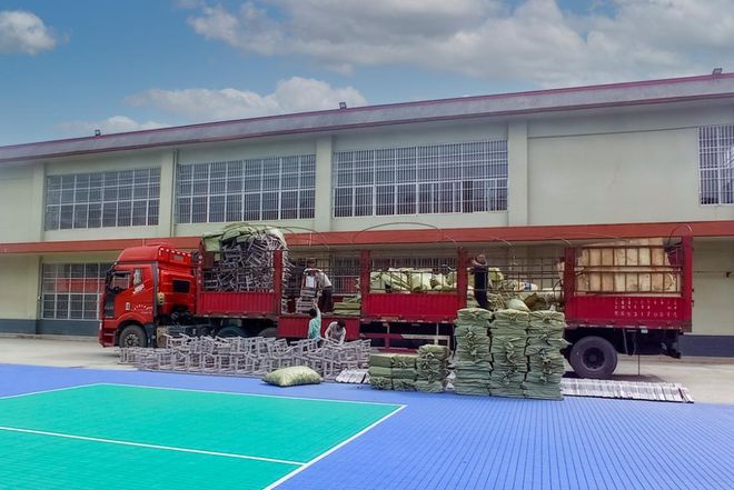 捐赠的课桌椅到货后,工作人员开展搬运工作
